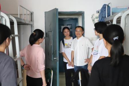9月13日下午,统计学院迎新工作已基本进入尾声,学院党委书记陶春海在各班助班的陪同下走访2020级新生寝室,与新生进行了亲切的交谈。