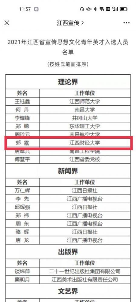 12月17日,2021年江西省宣传思想文化英才入选人员名单已确定并公示,统计学院副院长郭露教授入选江西省宣传思想文化青年英才名单(理论界)。