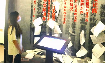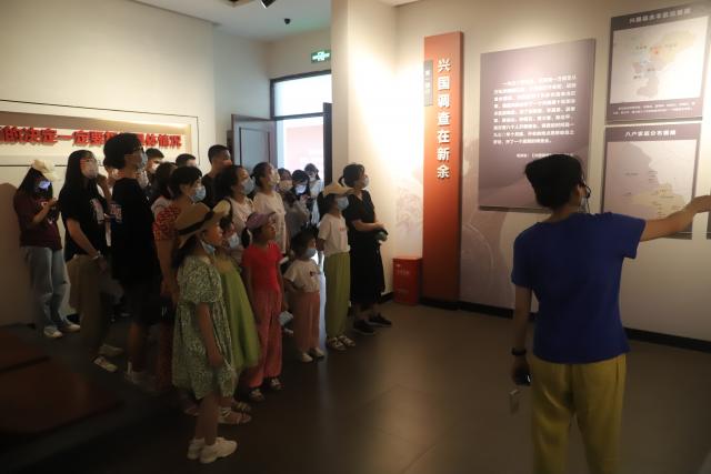 图为欧美视频 统计学院学子们在兴国调查陈列室听讲解员介绍历史故事。