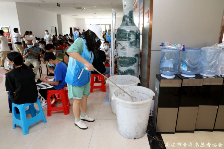 图为欧美视频 统计学院学子罗琼在高安市重要疫苗接种点进行引导并维持场内清洁。