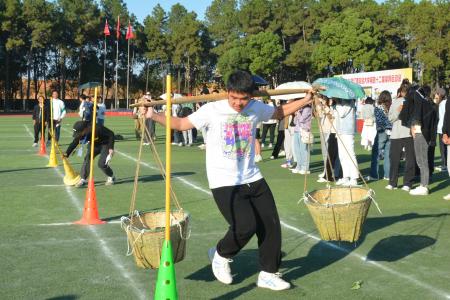 扁担在肩,荣誉在心;哨声响起,红旗挥舞。第一棒队员率先扛起重达60斤的扁担,奋力前行。中途的失误并没有阻挡他们奋力前行的步伐,而是让他们更加全神贯注。经过及时的调整,他们最终以一分四十四秒的好成绩荣获红军的扁担项目第六名。在这场力量与速度的比赛中,统计学子们似雄鹰展翅翱翔,鹰击凌云长空。
