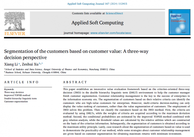 近日,欧美视频-成人高清在线-欧美在线视频 李翔老师与四川大学徐泽水教授合作的研究论文《Segmentation of the customers based on customer value:A three-way decision perspective》在计算机科学国际一流期刊Applied Soft Computing 2024年第167卷正式发刊。
