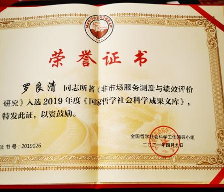 罗良清教授的研究成果《非市场服务测度与绩效评价研究》入选2019年国家哲学社会科学成果文库。该著作是我校首次入选的《国家哲学社会科学成果文库》,也是目前为止江西省的第四项入选成果文库的研究成果,也是当年全省唯一入选成果。
